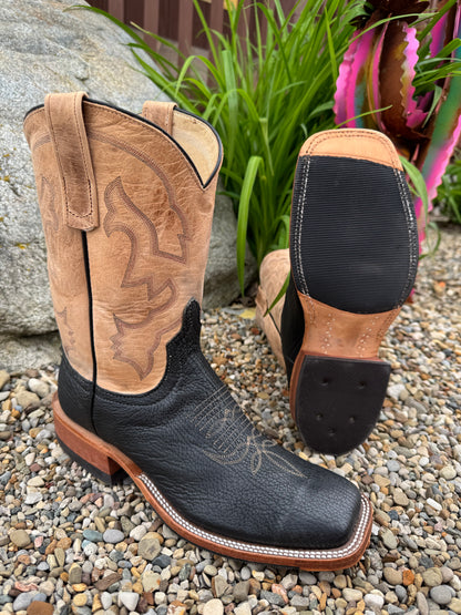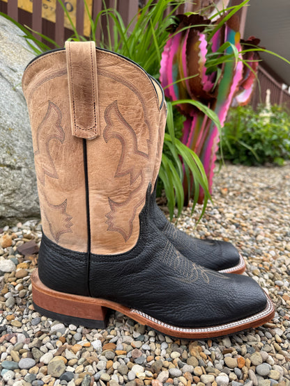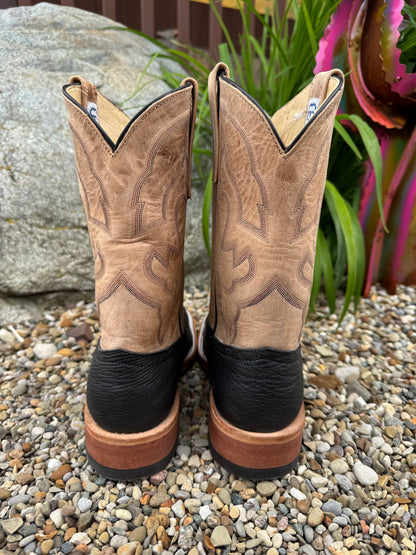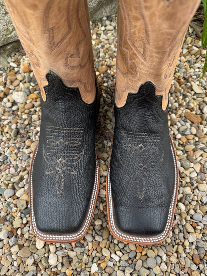 This beautiful boot is made with a sharp black Shark vamp with a perfectly contrasting Bone Mad Cat leather shaft. Designed with the hybrid outsole for ultimate comfort and resistance to wear. The hybrid is AB's most popular sole. It features a long-wearing, flexible PVC insert in the ball area of our prime leather sole, and it has a ribbed surface that improves grip and is lightweight and super flexible from the first step—handcrafted in the USA. Don't miss out on this unique boot!