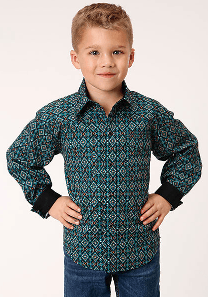 Ariat Boy's Team Philbert Black & Teal Geo Print Classic Fit Button Long Sleeve Western Shirt 10062397