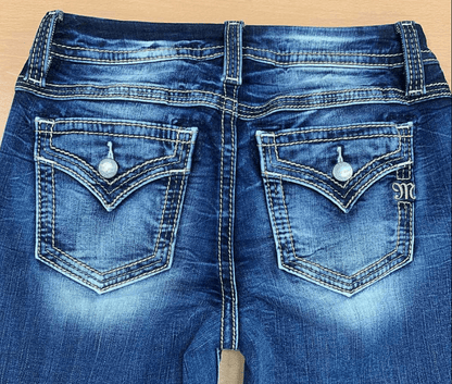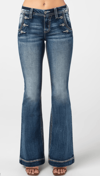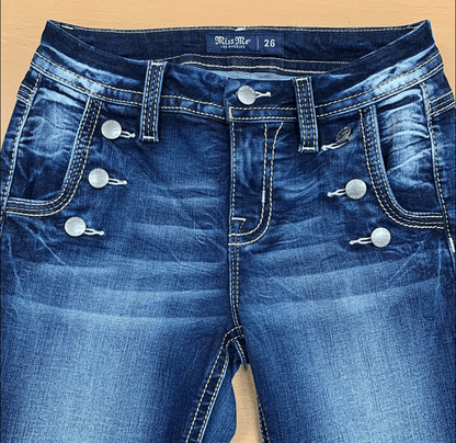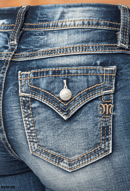 For that girl who loves a little extra but also wants to keeps it simple, check out this beautiful stitched edge border flap pocket Miss Me design! Medium wash, mid-rise, and adorable sailor trouser buttons - this jean is your new perfect go-to.